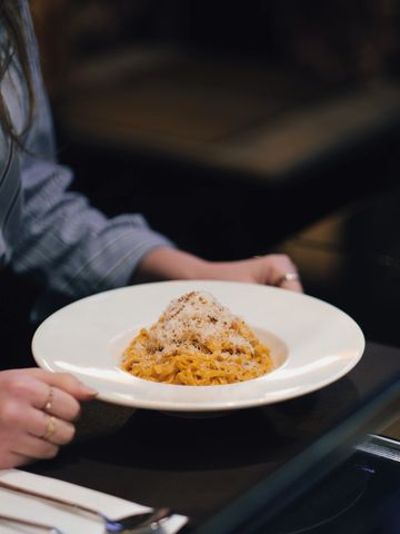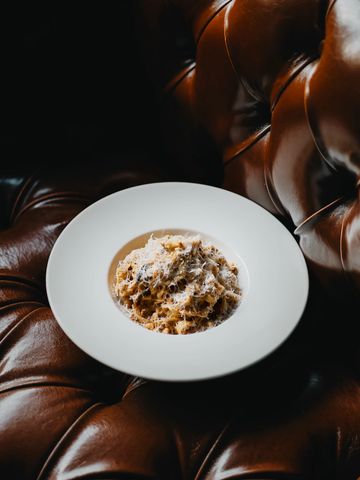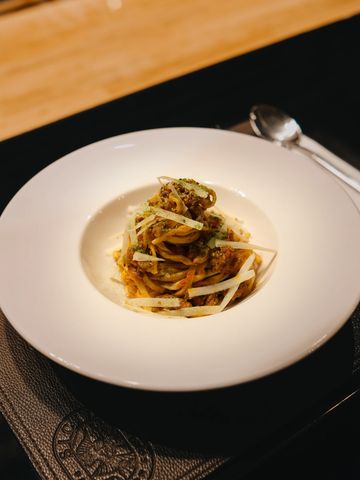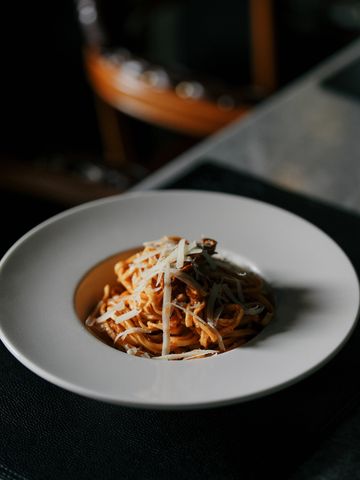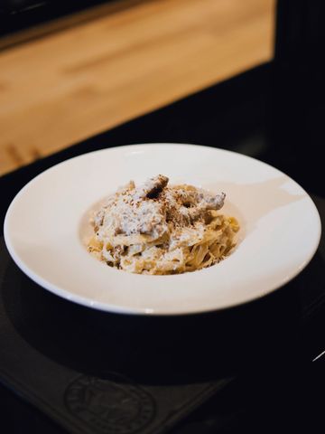 Krema, Kültür mantarı, Karamelize soğan, Ceviz, Karabiber, Parmesan peyniri. (Heavy cream, Button mushroom, Caramelised onion, Walnut, Black pepper, Parmesan cheese.