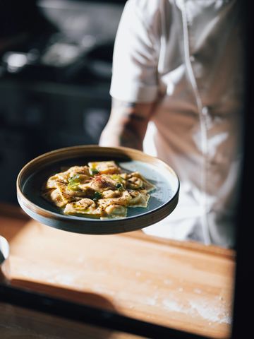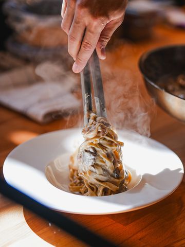 İstiridye mantarı, Kestane mantarı, Kültür mantarı, Ceviz. Suda mozzarella, Krema. (Oyster mushroom, Button mushrooms, Walnut, Mozzarella, Heavy Cream.)