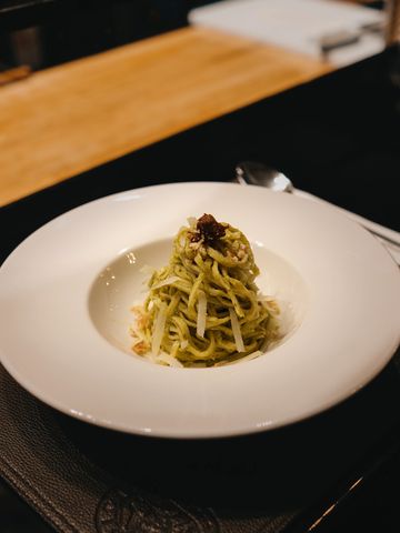 Krema, Fesleğen püresi, Parmesan peyniri, Sarımsak, Çam Fıstığı. (Heavy cream, Basil puree, Parmesan cheese, Garlic, Pine nut.)