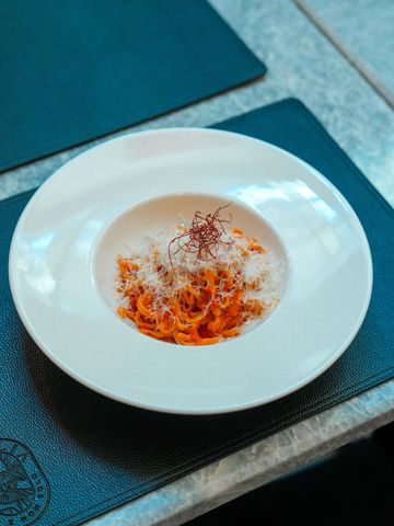 Somon füme, Rezene, Suda mozzarella, Krema, Roka, Karabiber, Limon. (Smoked salmon, Fennel, Mozzarella, Heavy cream, Rucola, Black pepper, Lemon.)